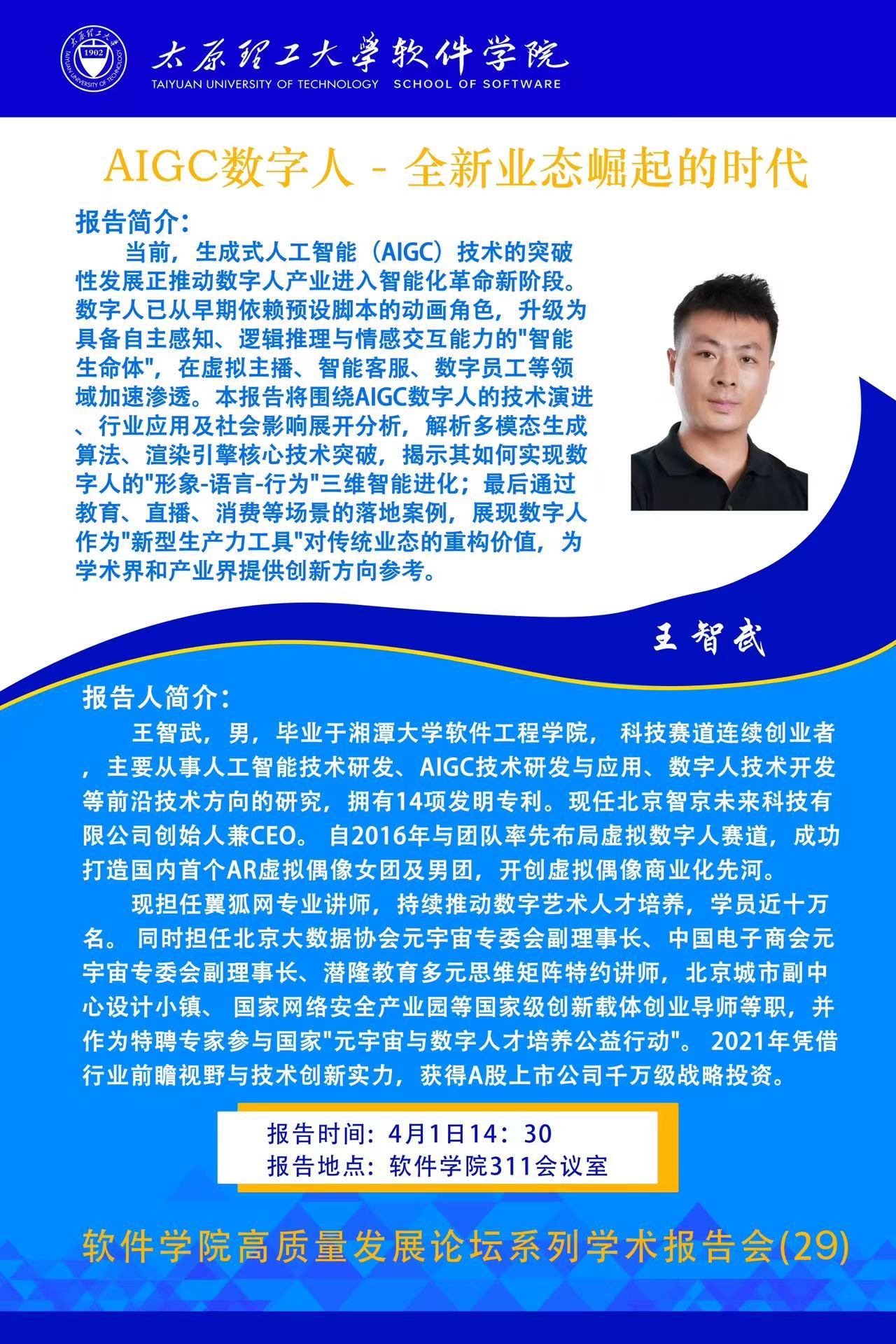 2025年4月1日下午,太阳成集团tyc122ccvip高质量发展论坛系列学术报告会(第28场)在公司楼311会议室顺利举行。本次报告以“AIGC数字人-全新业态崛起的时代”为主题,由北京智京未来科技有限公司创始人兼CEO、AIGC与数字人技术领域的前沿探索者王智武先生主讲。