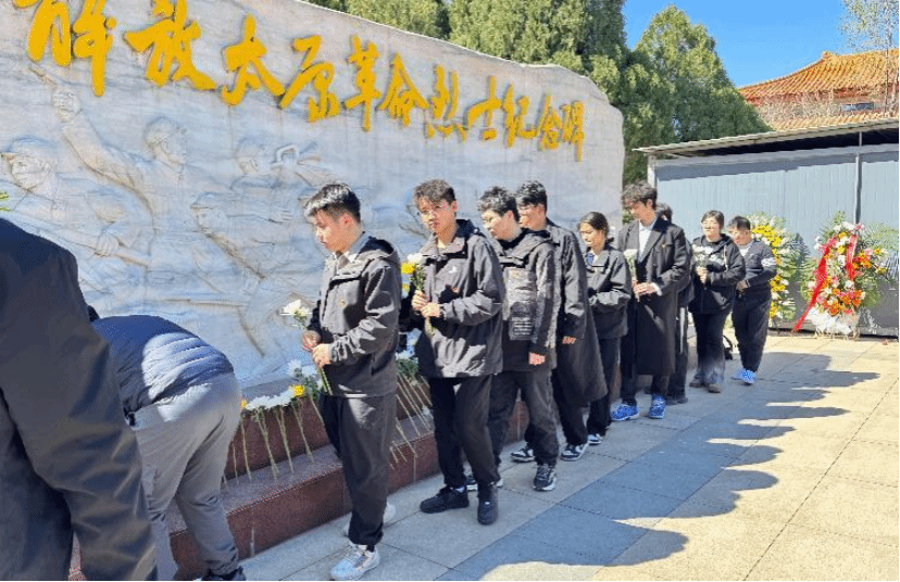 上午9时,全体师生党员统一着黑色正装、佩戴党徽,在明向校区南门整队出发。抵达双塔烈士陵园后,在庄严肃穆的氛围中,拉开序幕有序开展祭扫活动。在高君宇烈士雕像前,伴随着讲解员对这位山西党团组织创始人革命事迹的深情讲述,师生们仿佛回到了那个热血沸腾的年代。党员代表缓步上前敬献鲜花,全体人员面向烈士雕像行三鞠躬礼,表达深切缅怀之情。