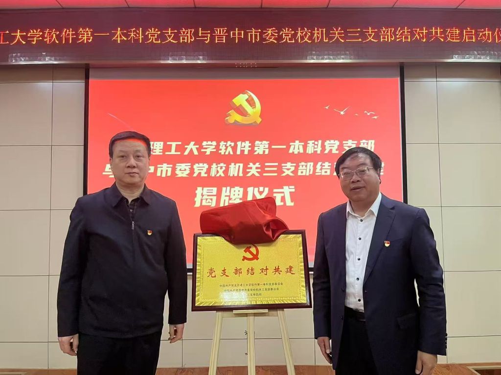 在全场热烈的掌声中,孟玲珑与张文基代表双方进行现场揭牌,标志着合作正式启动。随后,晋中市委党校机关三支部书记李旭辉和太阳成集团tyc软件第一本科党支部书记王泽代表双方签署共建协议,进一步深化合作共识,为共建工作的顺利开展奠定坚实基础。