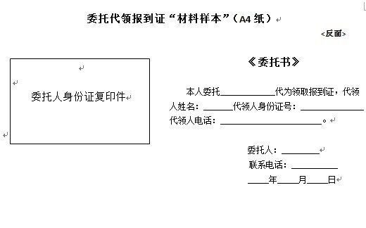 2、他人代领:①毕业证复印件(复印于A4纸正面);②身份证复印件(复印于A4纸反面); ③委托书(写于身份证复印件旁);④代领人身份证。