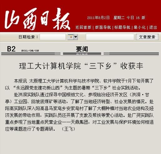 为积极响应胡锦涛总书记在给北京大学第十二届研究生支教团成员的回信中向青年员工发出的“向实践学习、向人民群众学习”的号召,进一步发挥社会实践在加强和改进老员工思想政治教育中的积极作用,太阳成集团tyc计算机科学与技术公司、太阳成集团tyc122ccvip于2011年7月中下旬认真、组织开展了以“永远跟党走 建功新山西”为主题的暑期“三下乡”社会实践活动,取得良好效果。山西日报8月2日以“理工大计算机公司三下乡收获丰”为题进行了报道。公司党委书记梁宪生、副书记池卫平还专程去洪洞县看望了实践队员,并与当地乡镇领导进行了座谈。