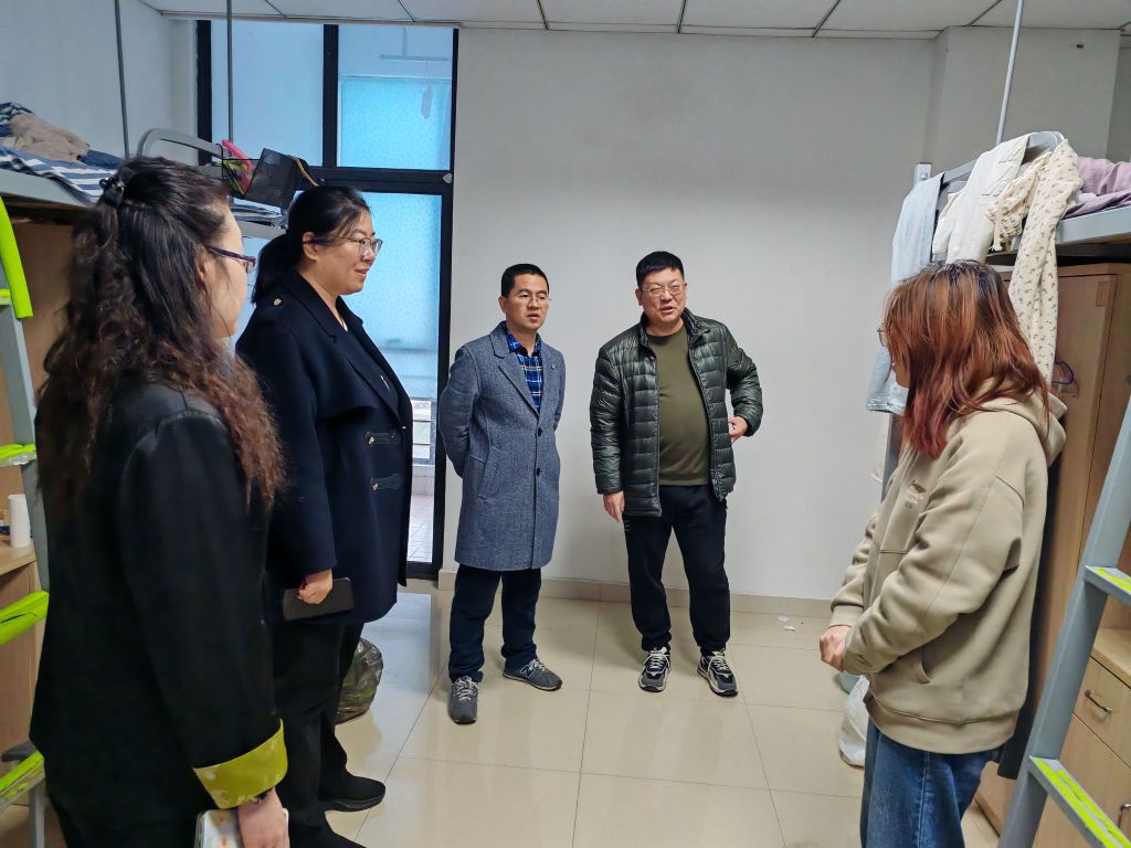 之后,潘燕春、郭飞一行先后参观基地的实训教学环境、深入走访实训员工宿舍,和基地员工代表、党员代表进行亲切座谈,详细了解同学们学习生活情况。