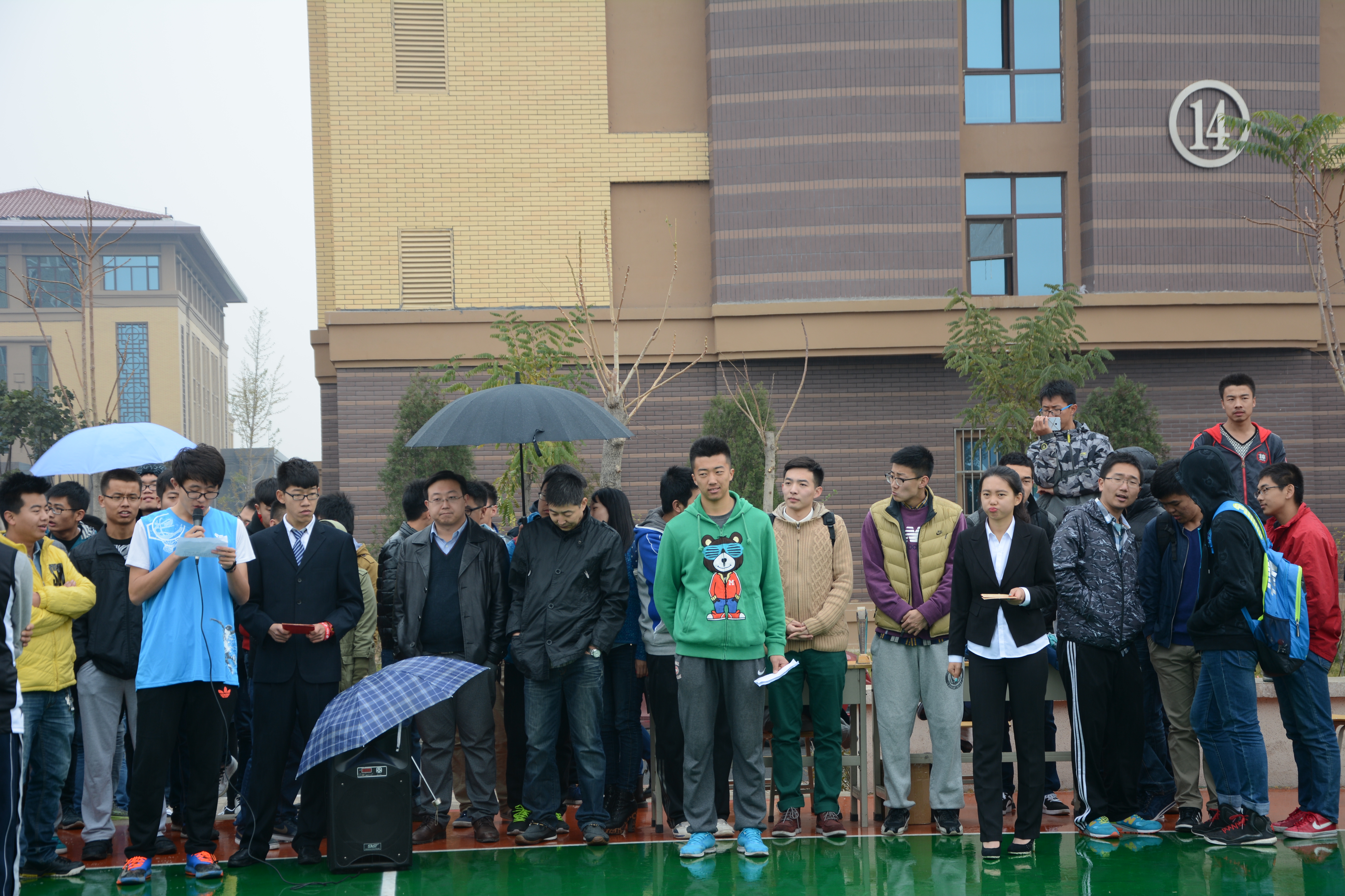 午十二时许,开幕式按时召开,尽管天气恶劣,同学们依然热情高涨。公司团委书记王飞老师,14级全体辅导员出席本次开幕式。开幕式上王飞老师致辞,他肯定了篮球赛的积极意义,同时也表达了对篮球赛的期待与祝福。随后, 113街舞社团和CUBA篮球宝贝带来了欢快劲爆的街舞表演和激昂动感的拉拉操使现场气氛更加轻松活跃,舒缓了运动员们面对比赛的紧张情绪。运动员代表和裁判员代表分别宣誓,运动员将弘扬“更高、更快、更强”的体育精神,以良好的精神风貌赛出风格,赛出水平,裁判员也将公平裁判,维护公正的体育裁决信誉。