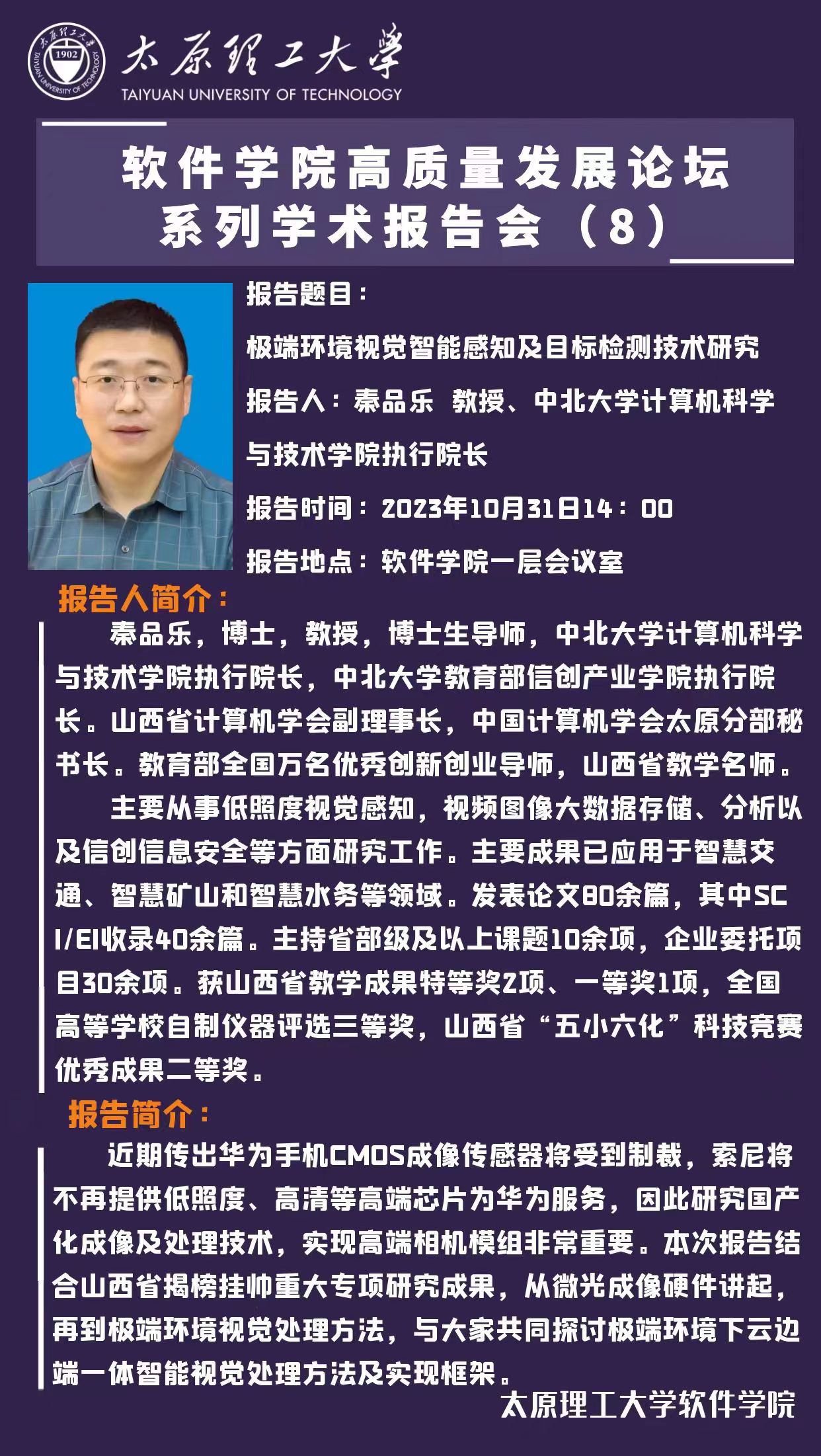 太阳成集团tyc122ccvip高质量发展论坛系列学术报告会(八)—《极端环境视觉智能感知及目标检测技术研究》