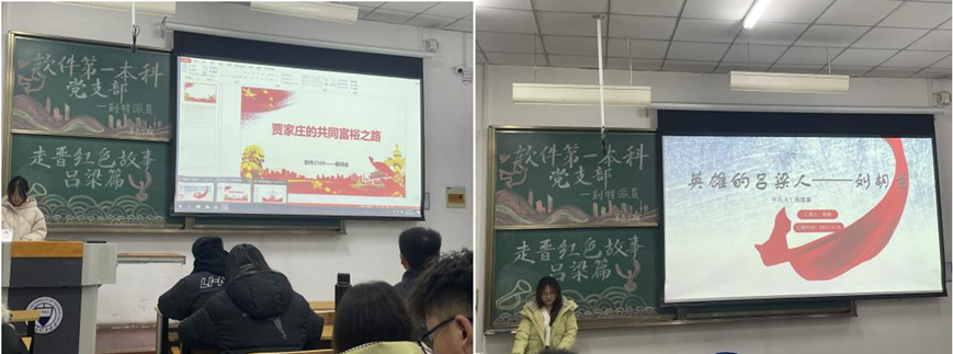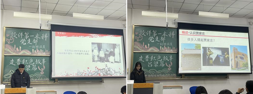 主持人李文璇介绍本期活动的主要内容,支部党员杨婧、张浩、谢诗谕依次分享发生在山西吕梁的红色故事。