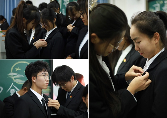 随着一个个团徽戴在胸前,每个新生干事的内心充满了激动和自豪。团徽全部戴在胸前,各部门部长组织干事进行合照并摆出他们的手势、喊出他们的口号、亮出他们的风采,展现了积极向上的精神风貌。