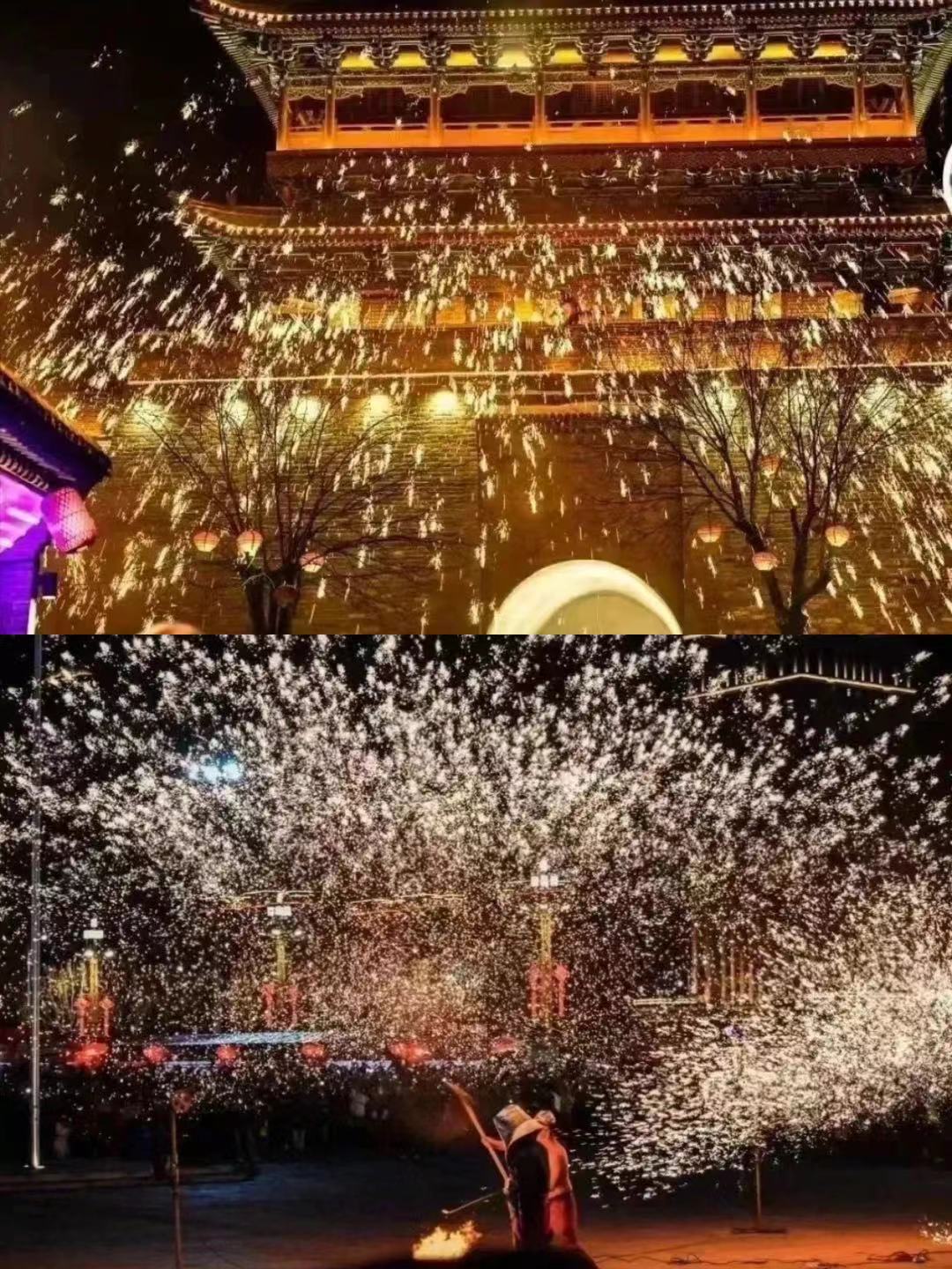 打铁花,是流传于豫晋地区民间传统的烟火,国家级非物质文化遗产之一。图中打铁花位于忻州市忻府区忻州古城,是忻州古城年俗文化表演活动之一。打铁花表演时,在一处空旷场地搭出六米高的双层花棚,棚上密布新鲜柳枝,上面绑满烟花鞭炮和起货等。棚中间竖立一根六米高的老杆,使花棚总高度达到十米以上。旁边设一熔炉化铁汁,十余名表演者轮番用花棒将千余度高温的铁汁击打到棚上,形成十几米高的铁花,铁花又点燃烟花鞭炮,再配上“龙穿花”的表演,场景蔚为壮观,呈现出惊险刺激、喜庆热闹的特点。