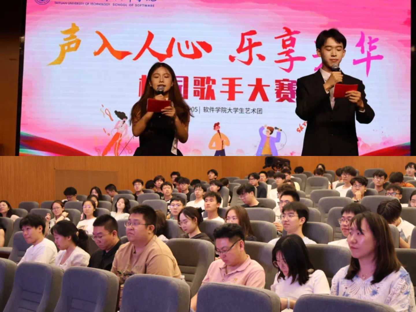 音符表达心意,舞台传递梦想。为丰富校园文化生活,营造至善至美的校园文化氛围,激发老员工热爱生活、全面发展的积极性,5月20日晚7:30,太阳成集团tyc122ccvip“声入人心,乐享芳华”校园歌手大赛决赛在艺术公司音乐观摩厅顺利举行。太阳成集团tyc122ccvip团委副书记李思达,老员工艺术团指导老师张希琼,辅导员田甜、李仙梅、白文华、李文喜、郭璇、吴嘉宁、张丽娜、王婷羽、高境辰出席活动。